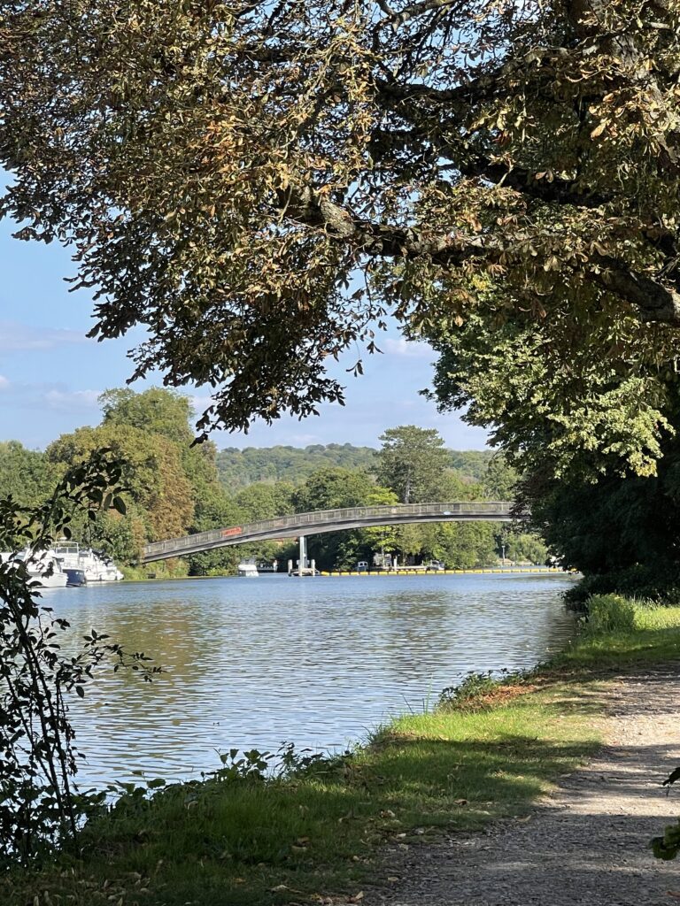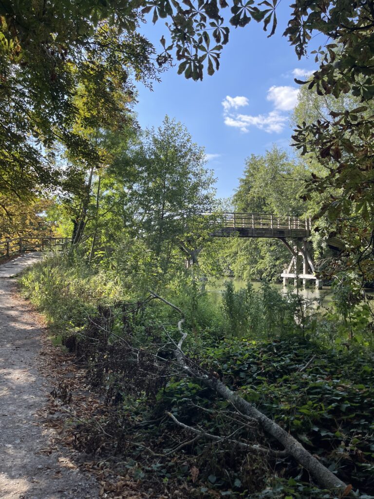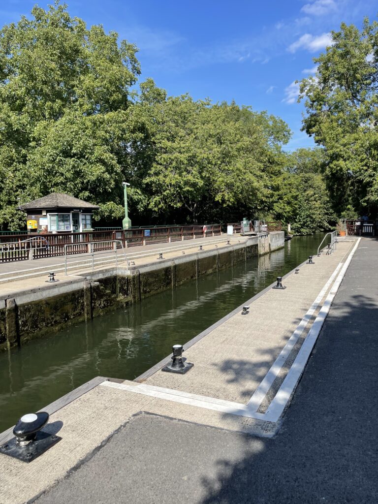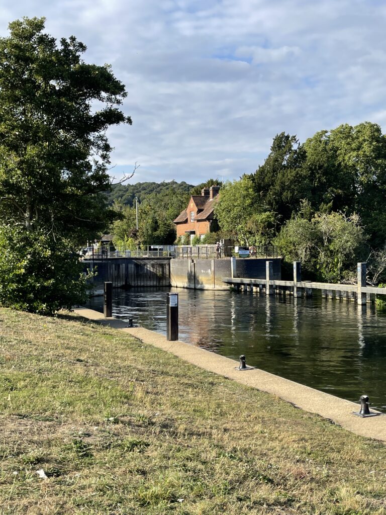 Back on the Thames Path, we walked towards Hurley Lock, nestled among wooded islands. We crossed a bridge to one of these islands, discovering an idyllic picnic spot with plenty of tables. First constructed in 1773 and rebuilt in 1785, the Lock underwent additional repairs in 1910. The Weir is also the site of the annual Hurley Classic paddle sports event.