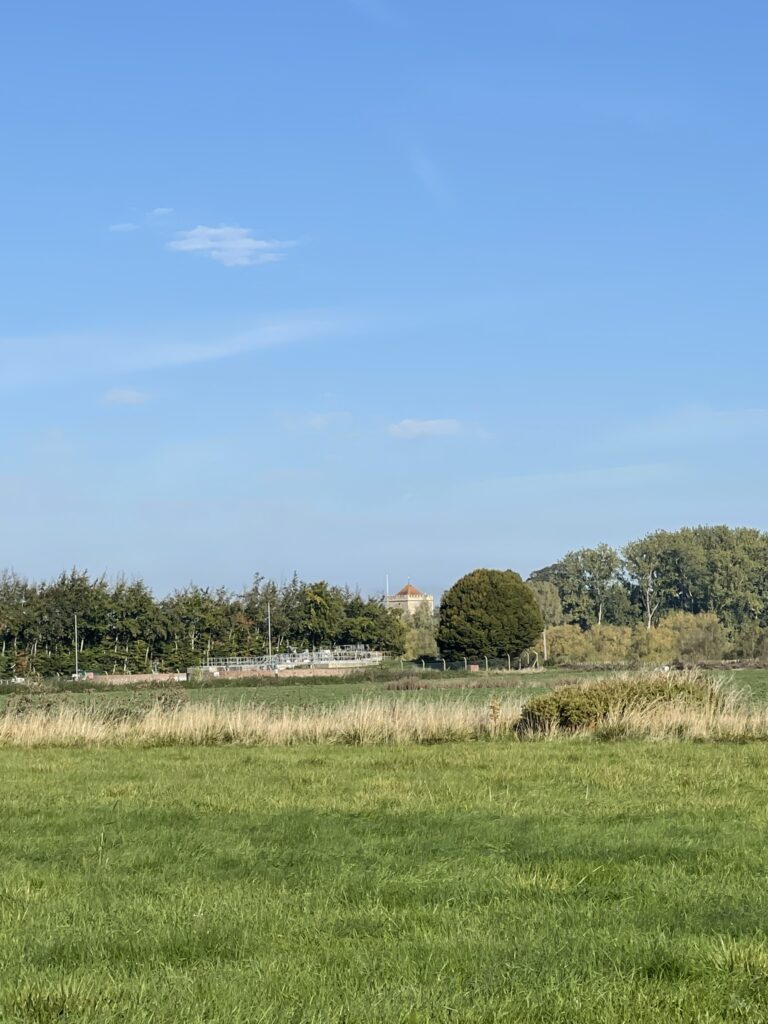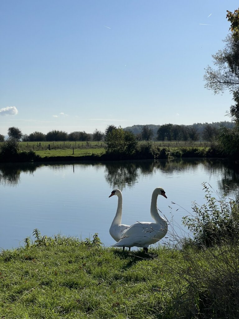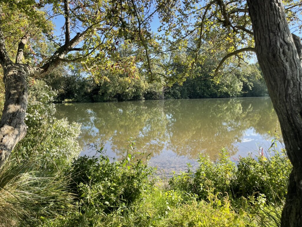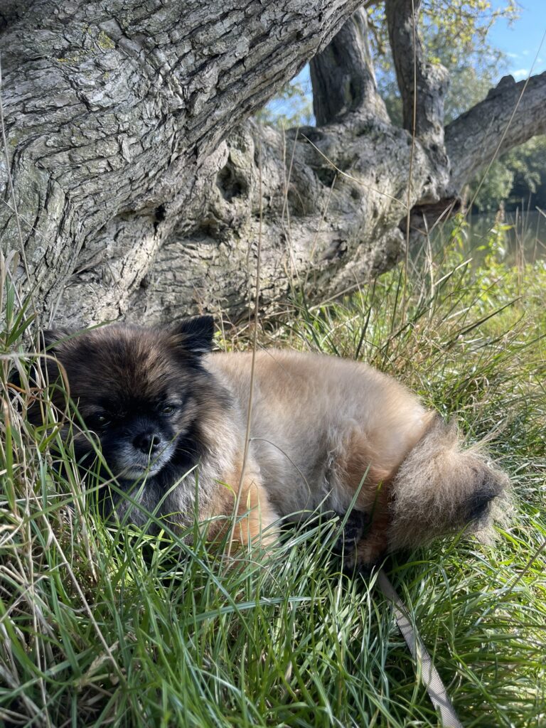 After crossing over at the weir, we took our first break, enjoying the noisy ducks. A large bend in the river stretched ahead, and while I wished we could cut across the land to save time, I was committed to following the path properly! We walked for another 30 minutes before deciding to rest again, leaning against a fallen tree. Cher was initially hesitant to leave her carrier, fearing she wouldn’t be allowed back in. However, she soon settled, curling up in the grass and almost drifting off to sleep. The setting was incredibly serene; no one else was around, and the gentle sound of the water was the only noise. We were in no rush, spending a good half an hour simply soaking in the tranquil surroundings. I spotted my first kingfisher, it was so quick, but distinctively a kingfisher from its brilliant colouring, swooping to catch its prey from the river before disappearing into the trees.